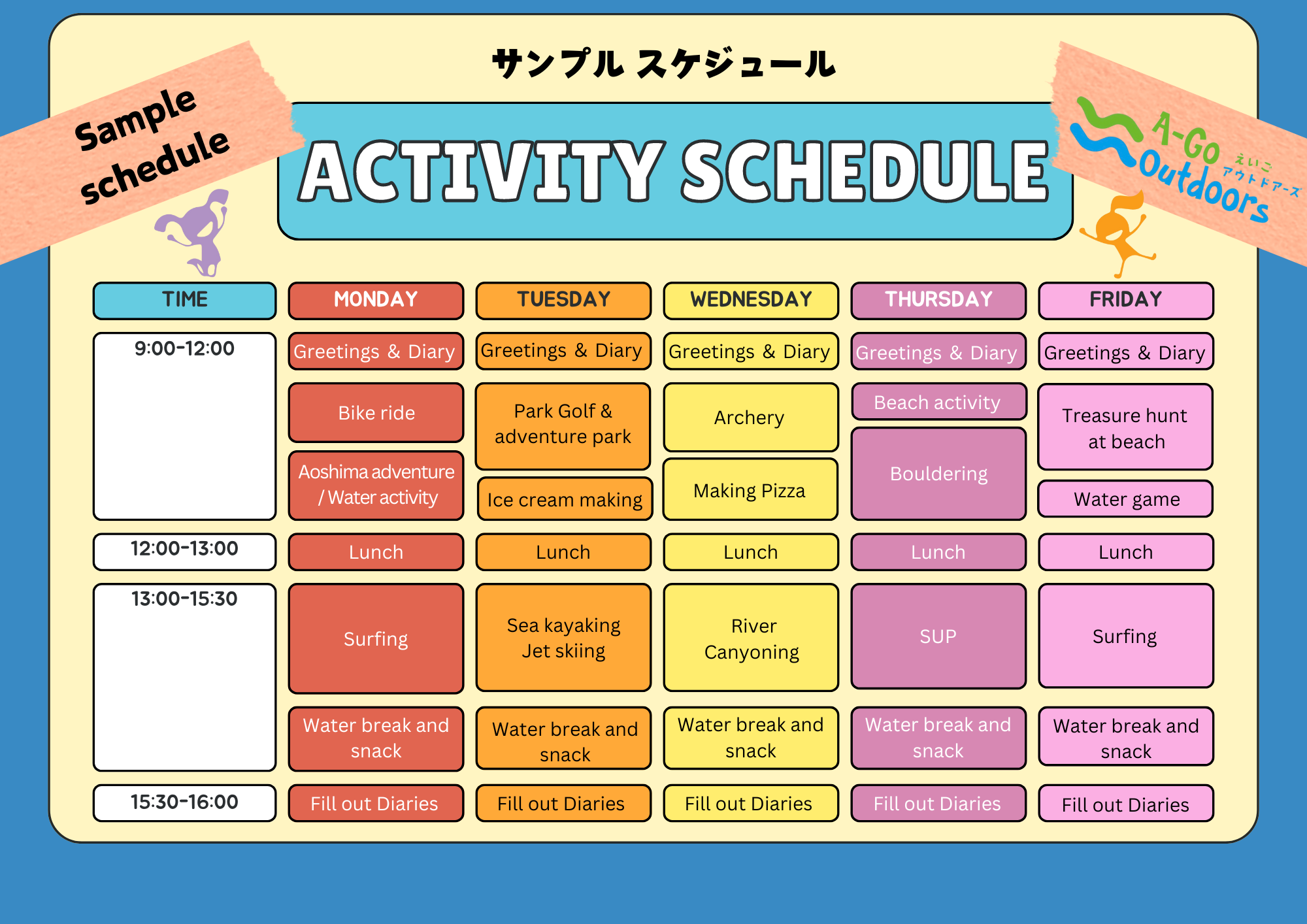 Activities at A-Go Outdoors are conducted by experienced native English speaking staff. Not only will you learn English, but you will also enjoy outdoor and indoor activities in the great nature of Aoshima, while being exposed to fun, live English. Join us for an exciting and memorable summer experience!